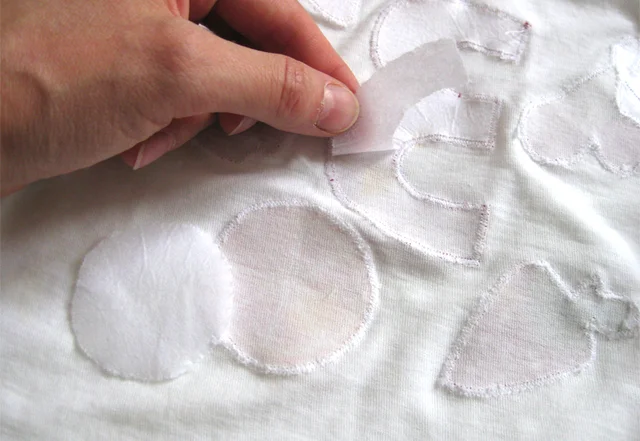 Bügelt bei einer Applikation auf einem T-Shirt auf die Rückseite des Vorderteils Fixier-Stickvlies (Vlieseline Fus-N-Tear 322) zur Stabilisierung auf. Die glatte Seite liegt dabei auf dem Stoff, die rauhe Seite zeigt nach oben (Bügeleinstellung: 2 Punkte, 5 Sekunden). Bei festen Stoffen könnt ihr darauf verzichten oder loses Stickvlies (Vlieseline Stich-N-Tear 314) unterlegen.