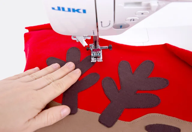 Appliziert erst den Kopf, dann das Geweih und näht anschließend die Kängurutasche auf.