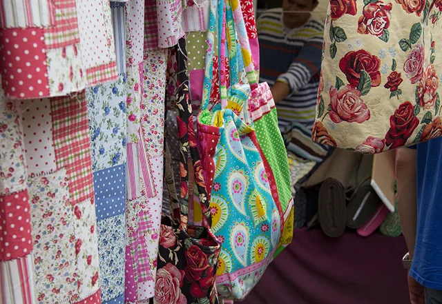 Stoffmarkt am Samstag, nur Stoffe und Kleinkunsthandwerk.