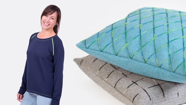 Für den optionalen Deckstich (Top Cover Stitch) ist bei der Janome ein Fadengeber integriert. Dieser wird bei Bedarf nach unten gedrückt, einfach eingefädelt und führt dann einen zusätzlichen Faden auf der Stoffoberseite mit. Da der Deckstichfaden den Stoff nicht durchdringt, kann für diesen auch Ziergarn eingesetzt werden, das sich sonst nur schwer vernähen lässt. So könnt ihr tolle Effekte erzielen und bspw. auch Kissen oder andere Heimtextilien dekorativ verzieren.