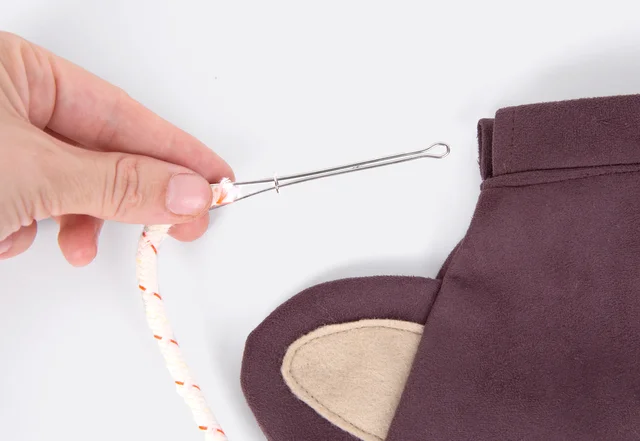 Halbiert die Kordel in zwei 1,5 m lange Stücke und fädelt sie einzeln in die Tunnel ein.