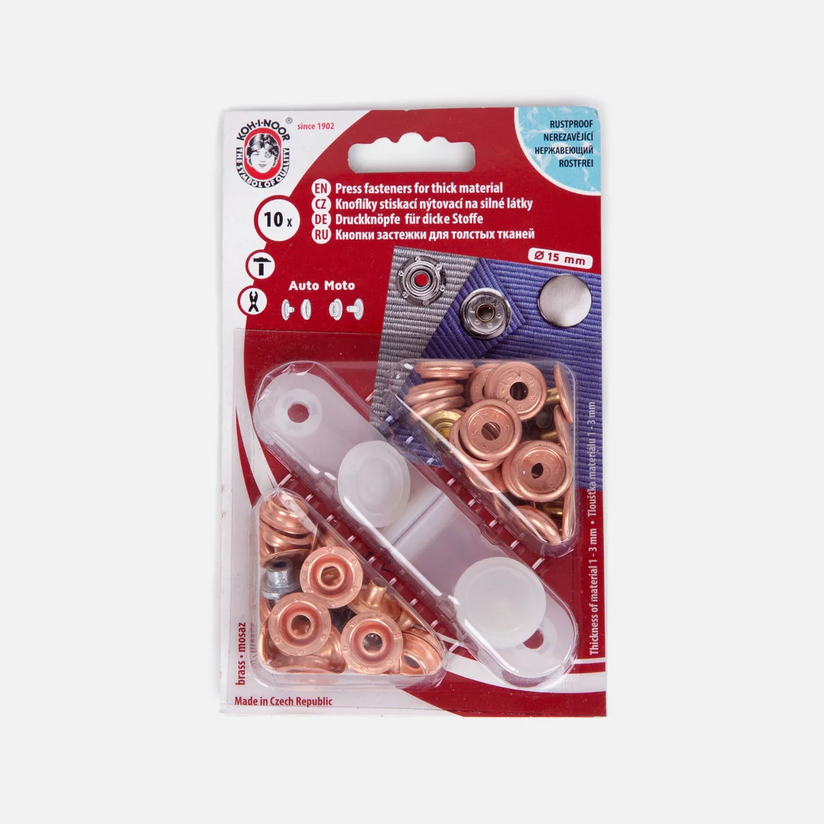 Mit diesen kupferfarbenen Anorak-Druckknöpfen werden deine selbst genähten Jacken, Mäntel und Taschen zu ganz besonderen Hinguckern! Die Verschlüsse werden einfach mit einem Hammer und dem beiligenden Werkzeug befestigt oder du nutzt dafür die praktische Variozange.