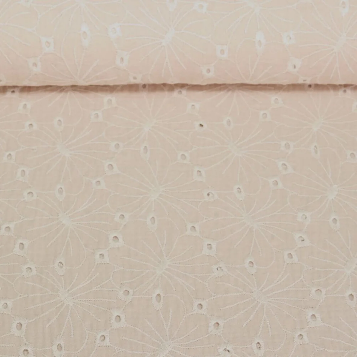Baumwoll Musselin Double Gauze Blumen Bestickt Beige