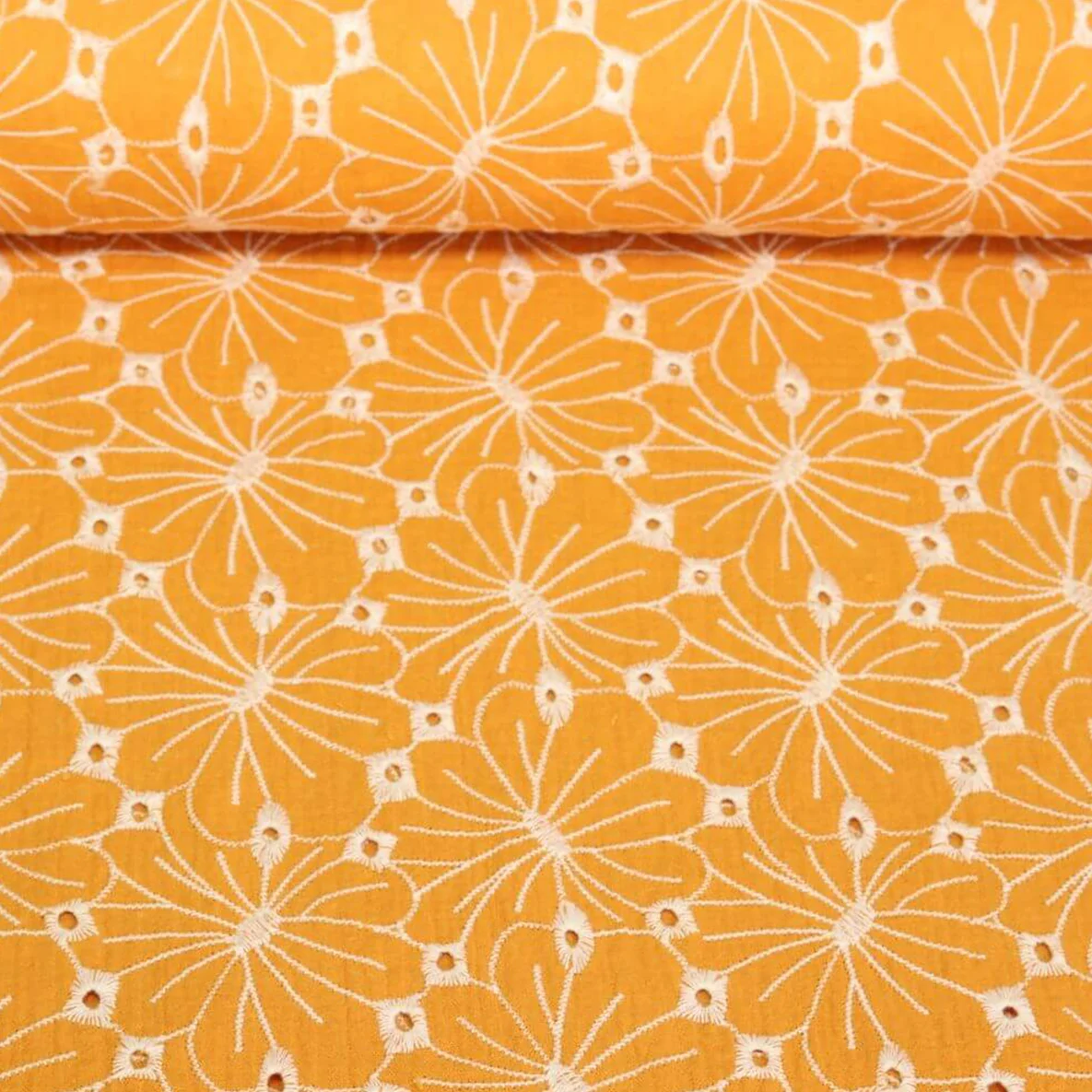 Baumwoll Musselin Double Gauze Blumen Bestickt Ocker