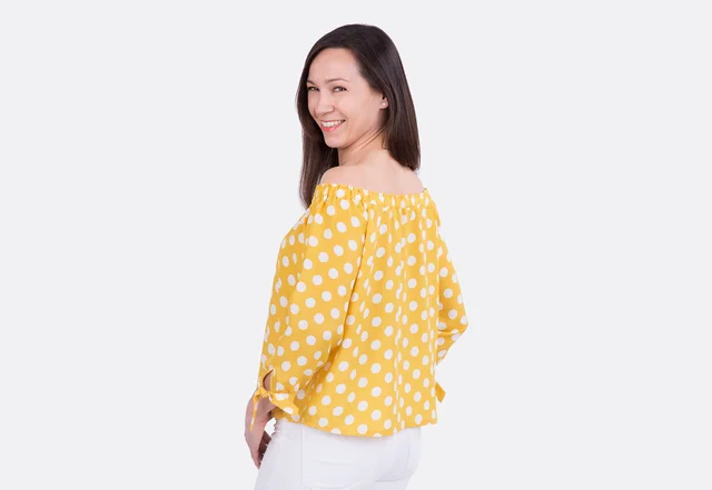 Unser Schnittmuster "Carmen" kann seinem Namen entsprechend auch wunderbar mit Carmen-Ausschnitt genäht werden. Mit Bindebändern an den Ärmeln wird es zu einer tollen Sommerbluse!