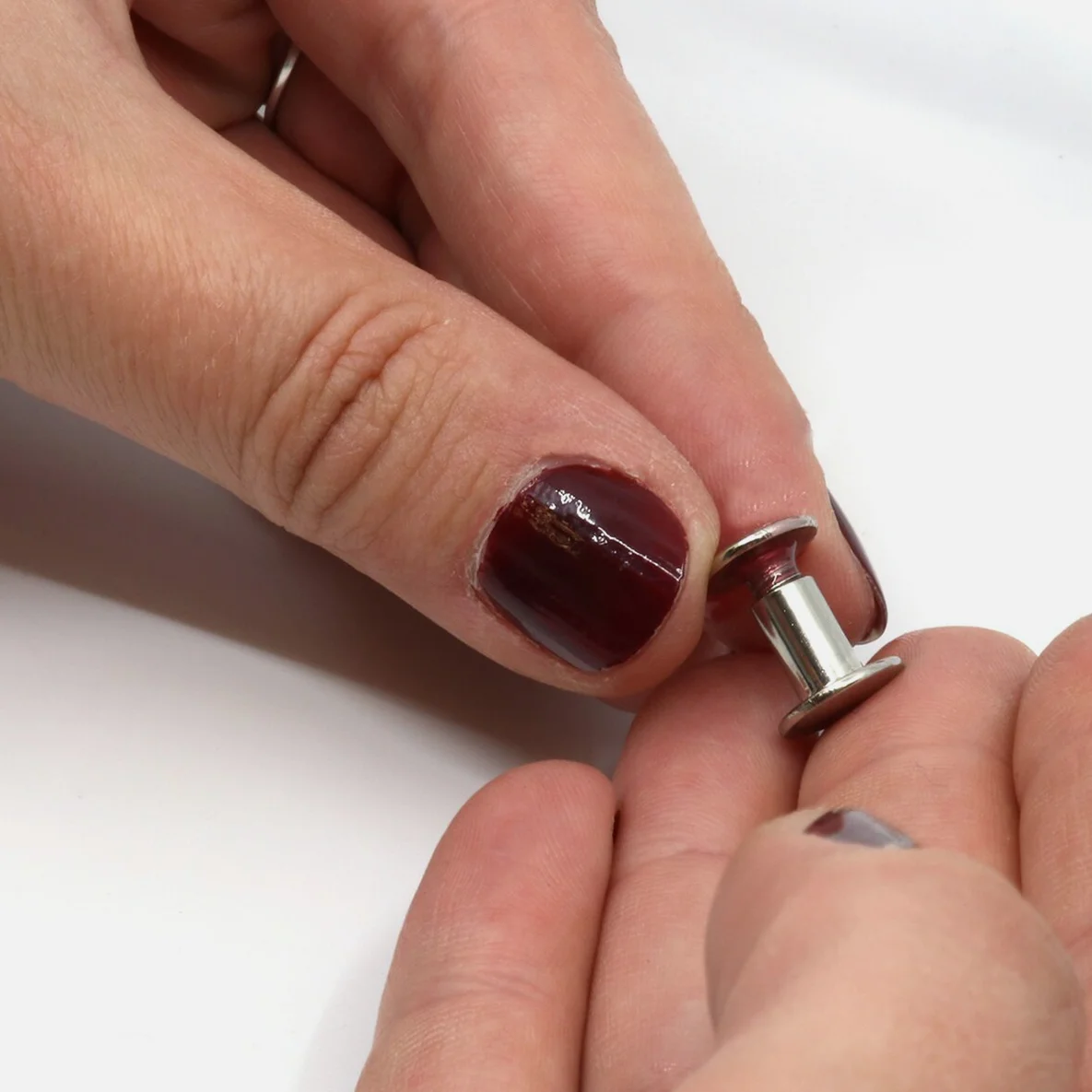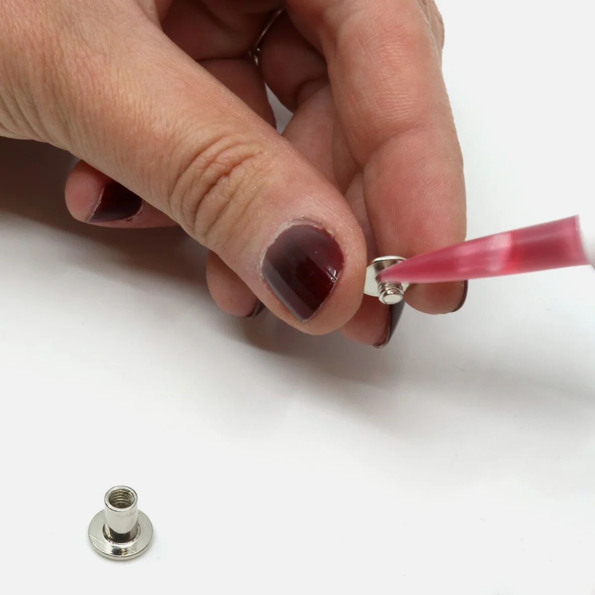 Nutze die praktische Schraubensicherung zum dauerhaften Fixieren von Buchschrauben an deinem Nähprojekt. Tropfe dafür einfach ein wenig Kleber auf das Gewinde, welcher sich beim Schließen der Schrauben gleichmäßig verteilt und diese dauerhaft miteinander verbindet.