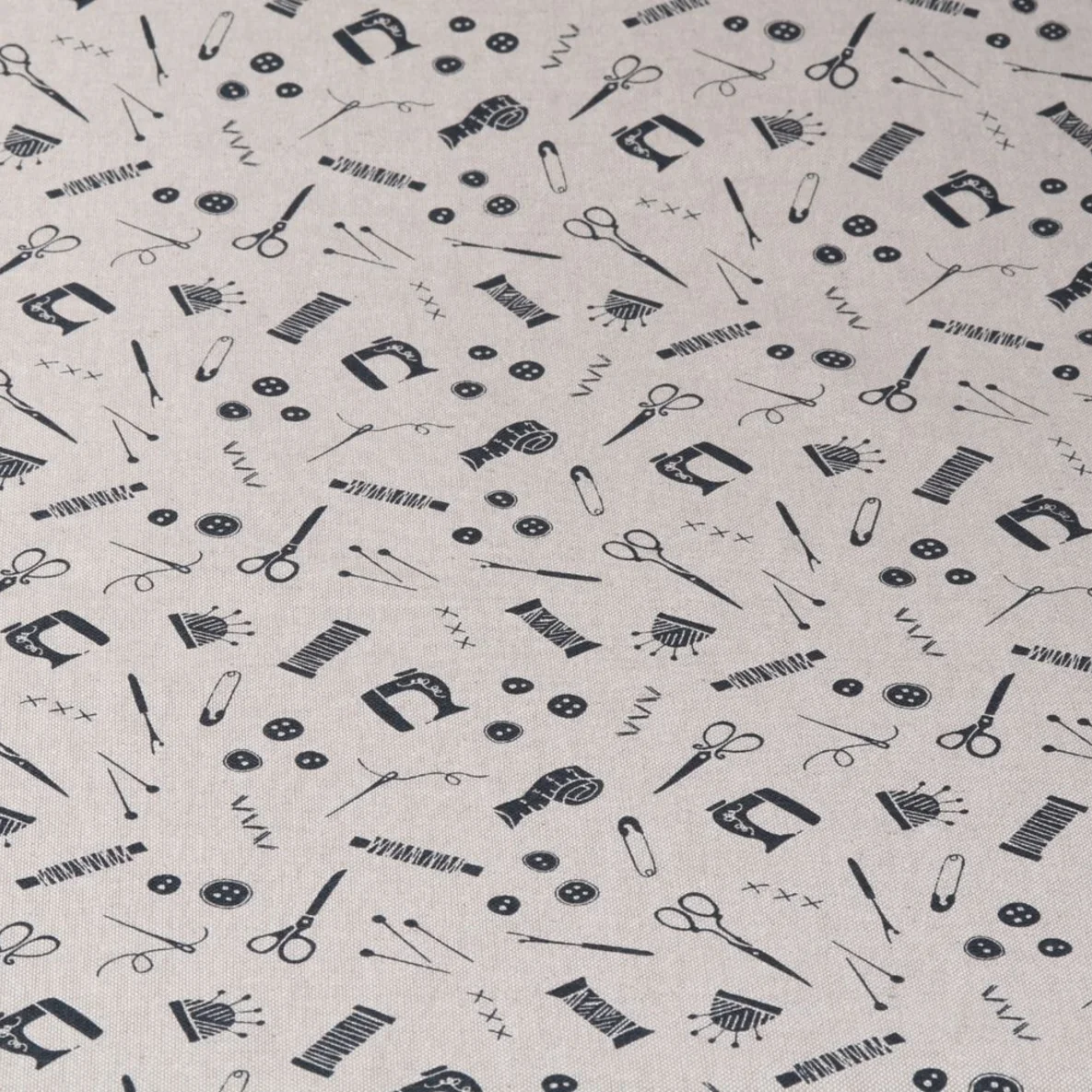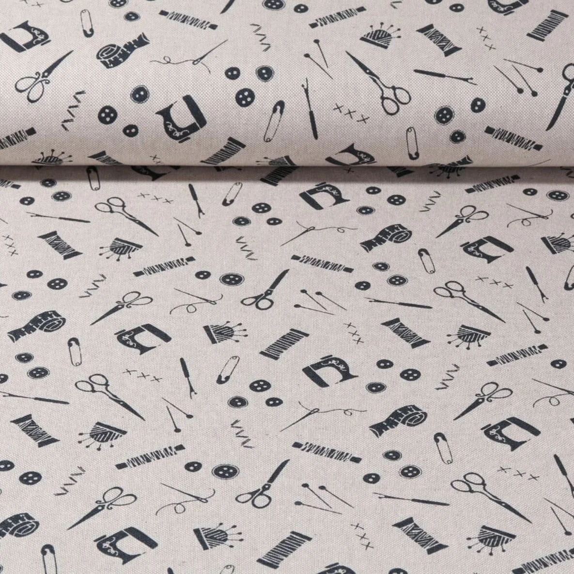 Dieser Canvas mit Nähatelier-Motiv und Leinenlook ist perfekt geeignet für Nähprojekte, die einen besonders haltbaren Stoff verlangen. Nähe damit schöne Wohnaccessoires wie Utensilos und Kissen oder auch praktische Shopper zum Einkaufen sowie kleine Kosmetiktaschen. Nutze den Stoff z.B. für unser Wendetaschen-Schnittmuster "Milly".
