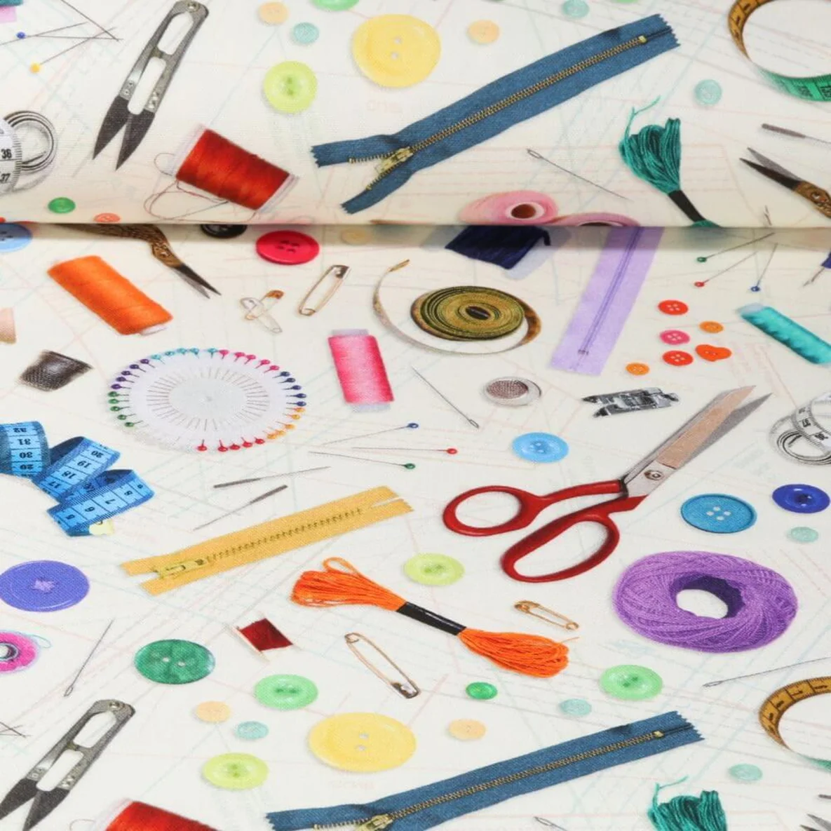 Dieser Canvas mit Nähzubehör-Motiv ist perfekt geeignet für Nähprojekte, die einen besonders haltbaren Stoff verlangen. Nähe damit schöne Wohnaccessoires wie Utensilos und Kissen oder auch praktische Shopper zum Einkaufen sowie kleine Kosmetiktaschen. Nutze den Stoff z.B. für unser Wendetaschen-Schnittmuster "Milly".