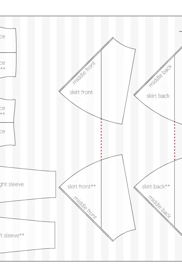 The front and back bodice pieces should be cut on a fold. This means the fabric piece for the dress will be separate from the skirt pieces. It is also important that the point of the underarm on both the front bodice and the sleeve lie on the same colour stripe.