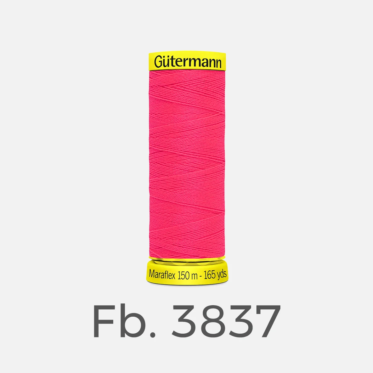 Mit dem elastischen Maraflex Nähgarn von Gütermann lassen sich dehnbare Stoffe problemlos mit einem Geradstich an der Nähmaschine nähen. Das Garn eignet sich hervorragend, um Halsausschnitte und Säume zu verarbeiten oder um Bündchen an Hoodies und Jogginghosen anzunähen.