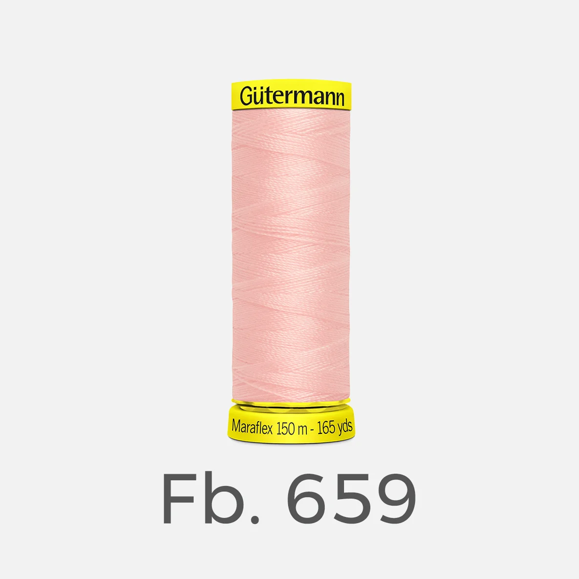 Mit dem elastischen Maraflex Nähgarn von Gütermann lassen sich dehnbare Stoffe problemlos mit einem Geradstich an der Nähmaschine nähen. Das Garn eignet sich hervorragend, um Halsausschnitte und Säume zu verarbeiten oder um Bündchen an Hoodies und Jogginghosen anzunähen.