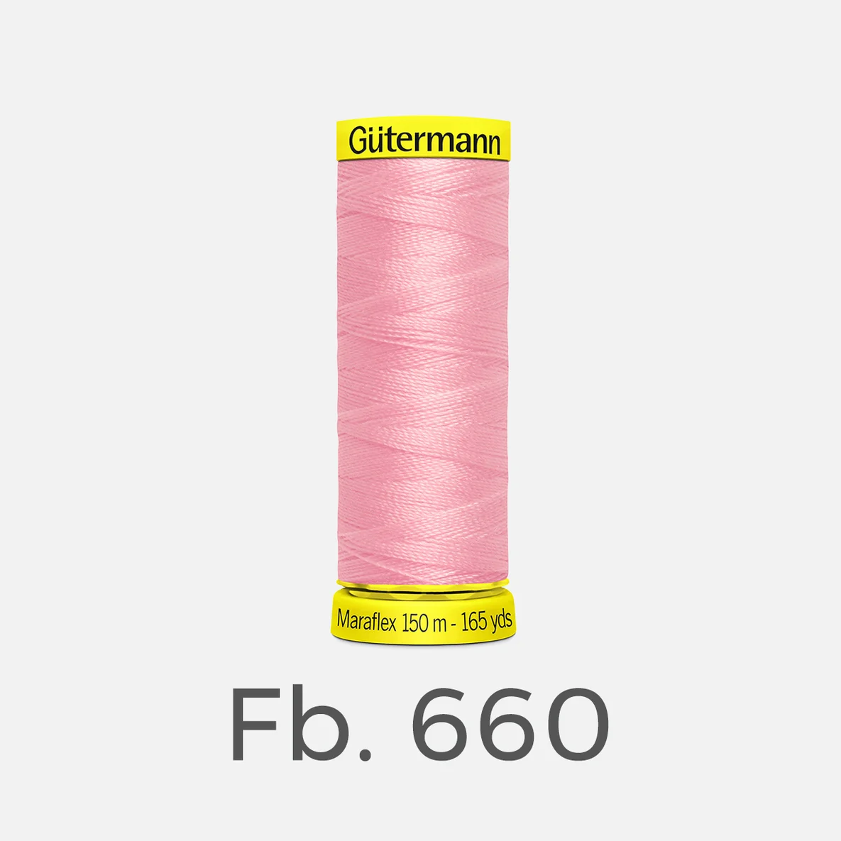 Mit dem elastischen Maraflex Nähgarn von Gütermann lassen sich dehnbare Stoffe problemlos mit einem Geradstich an der Nähmaschine nähen. Das Garn eignet sich hervorragend, um Halsausschnitte und Säume zu verarbeiten oder um Bündchen an Hoodies und Jogginghosen anzunähen.