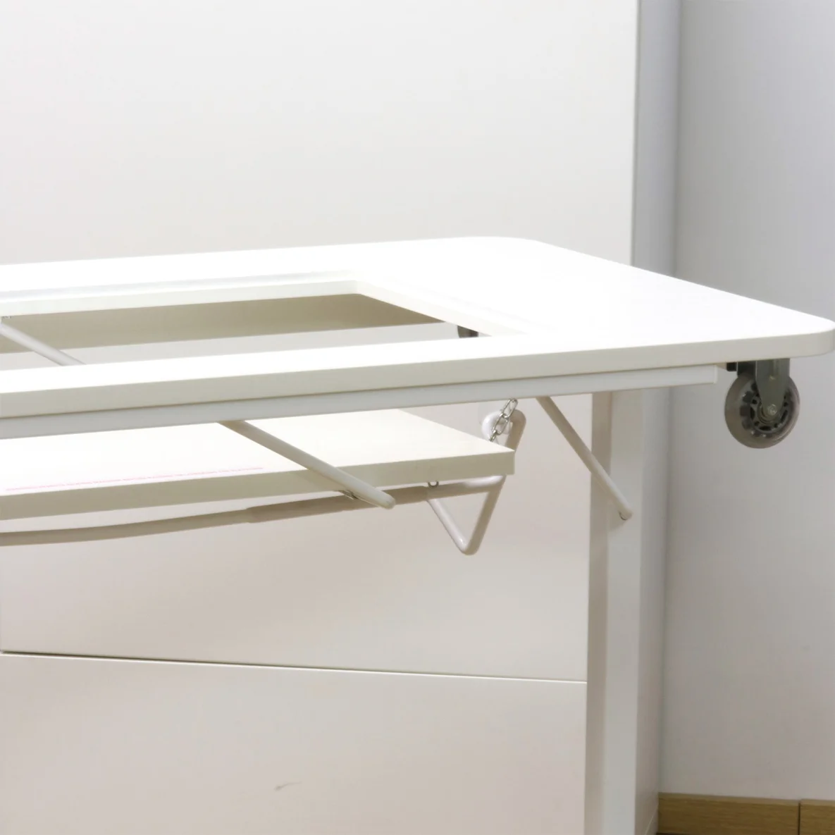 Dieser praktische Nähtisch kann nach dem Nähen schnell zugeklappt und verstaut werden. Somit ist er für kleine Nähecken sowie für eine flexible Raumnutzung wunderbar geeignet! Durch die klappbaren Tischbeine und die integrierten Rollen kann das Möbel platzsparend verstaut und leicht verschoben werden. Die Nähmaschine kann für ergonomischeres Arbeiten manuell im Tisch versenkt werden. Mithilfe der Ketten ist die Höhe der Maschine stufenweise einstellbar.