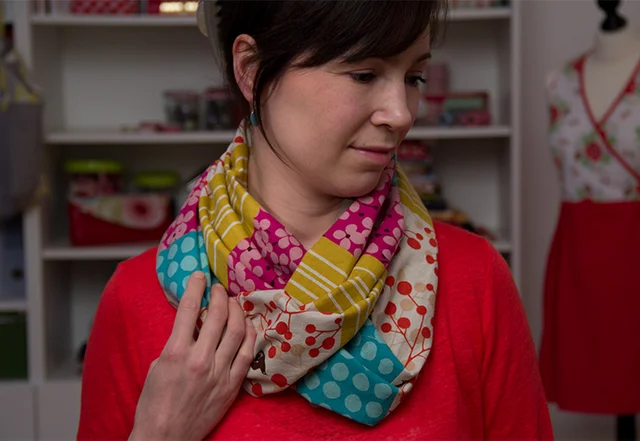 Mir gefällt es, einen bunt bedruckten Stoff mit einem passenden einfarbigen zu kombinieren. Zu einem schlichten Shirt getragen, ist der Schal dann ein schöner Blickfang. Wunderbar ist auch die Kombination von glatten Stoffen mit weichen, kuscheligen Stoffe wie Babycord oder Flanell.