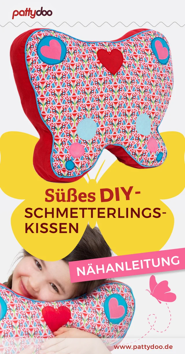 Das niedliche Schmetterlingskissen ist ein prima Begleiter zum Kuscheln, Rumlümmeln, für ein Nickerchen im Auto auf Reisen und sowieso eine tolle Geschenkidee. Schnell genäht, mit ein paar Applikationen versehen und ihr habt einen neuen Schmuseliebling.