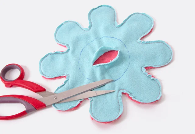 Schneidet nun mittig innerhalb des aufgezeichneten Kreises in eine der beiden Stofflagen vorsichtig einen ca. 3 cm langen Schlitz.
