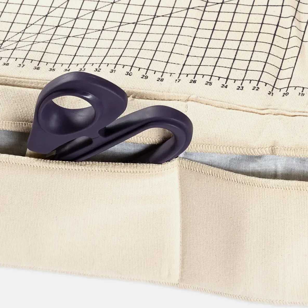 Richte Deinen Nähplatz perfekt ein mit der multifunktionalen Bügelunterlage! Die beige bedruckte Seite verfügt über eine cm Skalierung und Markierungen für Winkel. Auf dieser Oberfläche kannst Du perfekt messen, säumen, bügeln und nähen. Vor der Tischkante hängen drei Werkzeugtaschen, ein Nadelkissen, ein abnehmbarer Beutel für Stoffreste sowie eine Aufhängungsschlaufe für die Schere.