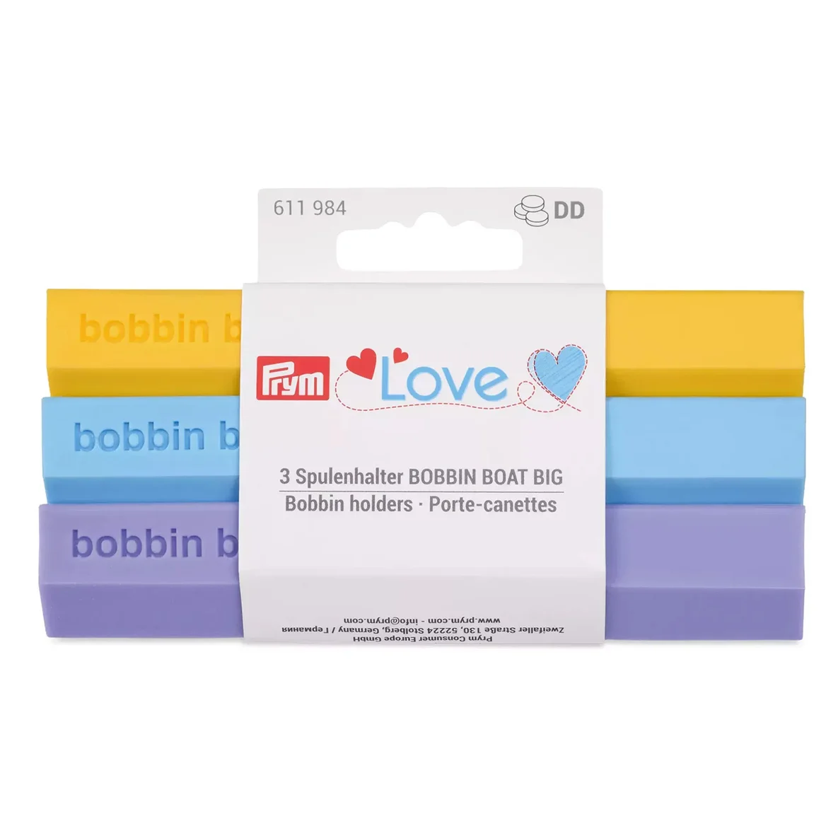Mit dem Spulenhalter-Set BOBBIN BOAT BIG von PRYM bewahrst du große Jumbo Size-Spulen mit einem Durchmesser von 26mm übersichtlich und platzsparend auf. Jeder Halter bietet Platz für bis zu 9 Spulen, ideal für Jumbo-Spulen der BERNINA 4er-, 5er- und 7er-Nähmaschinenreihe. Das flexible Kunststoffmaterial umschließt die Spulen fest, so dass sie nicht herausfallen können. Im Set enthalten sind drei Halter in den Farben gelb, blau und flieder. Spulen sind im Lieferumfang nicht enthalten.