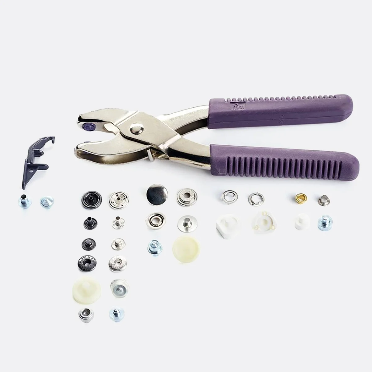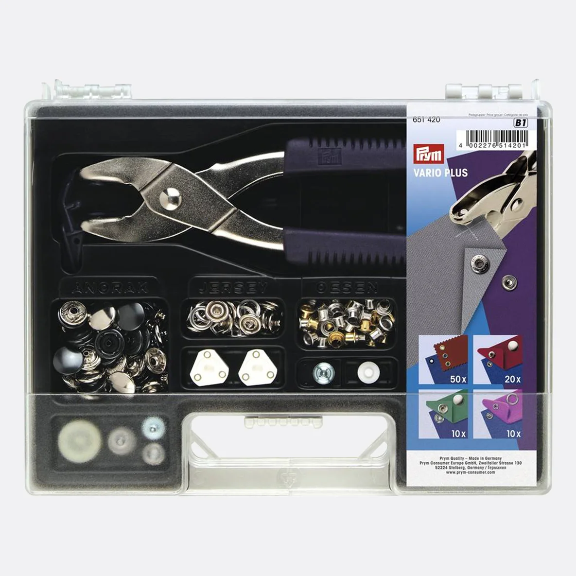 - Loch- und Vernietungswerkzeuge zum Verarbeiten der enthaltenen Druckknöpfe und Ösen