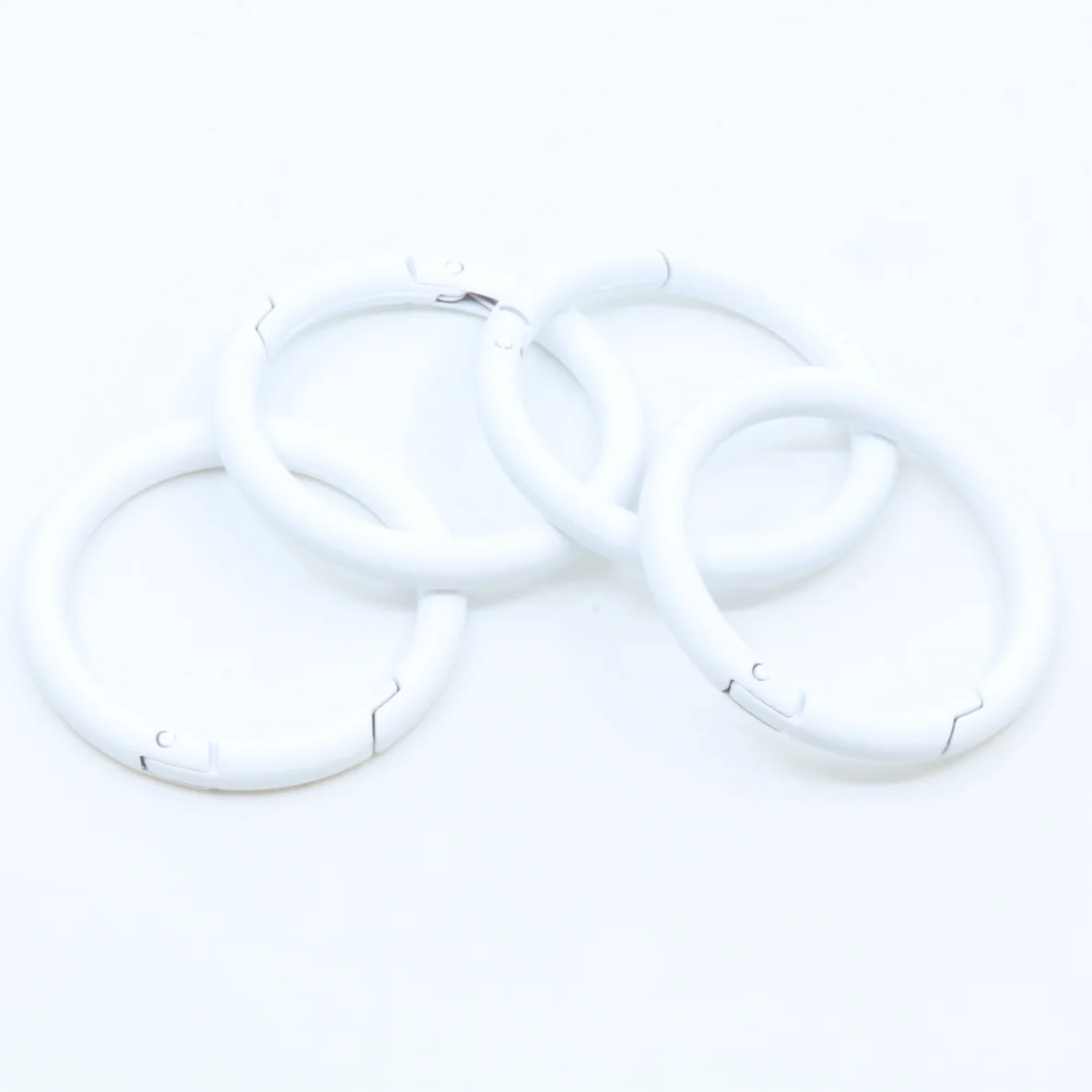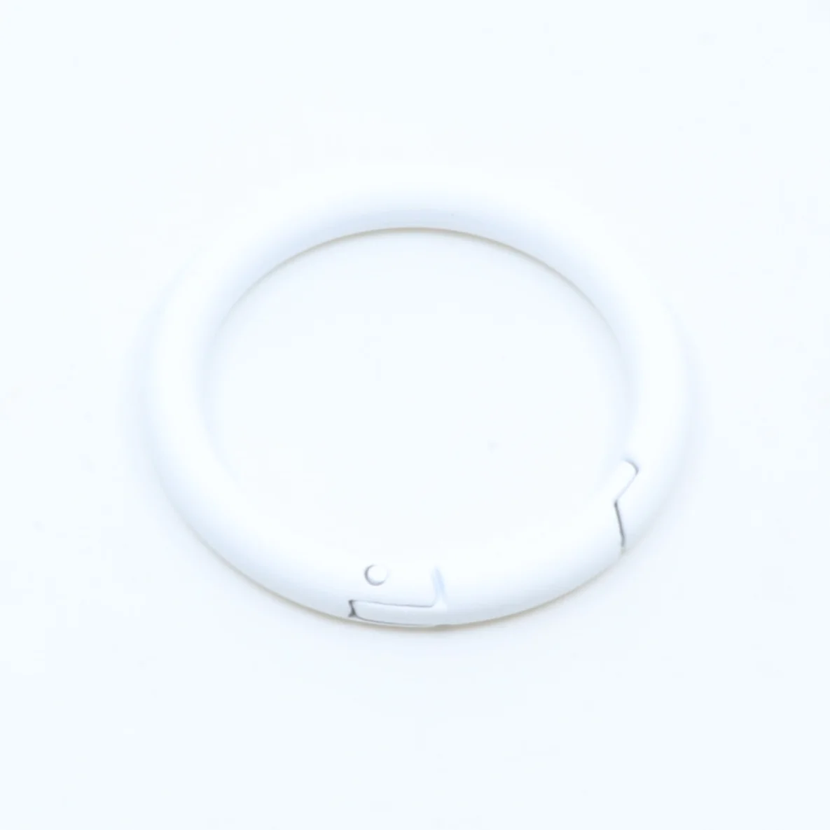 Dieser Ring mit Schnappverschluss ist eine stilvolle Alternative zu Karabinerhaken. So kannst du Taschenhenkel schnell anbringen und entfernen. Der Ring mit gummierter Beschichtung passt farblich zum anderen Metallzubehör in Weiß. Nutze den Ring zum Beispiel für unser Umhängetaschen-Schnittmuster "Annie".