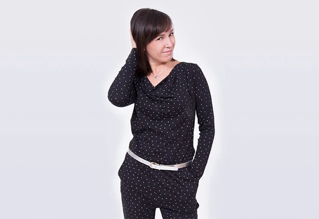 Für eine wintertaugliche Variante wollte ich unser Schnittmuster „Joy“ gerne mit langen Ärmeln nähen und wählte dafür unser Shirt „Scarlett“ mit Wasserfallausschnitt aus. Der weich fallende Ausschnitt ist wunderbar feminin und eignet sich durch die große Öffnung prima zum Anziehen des Einteilers.
