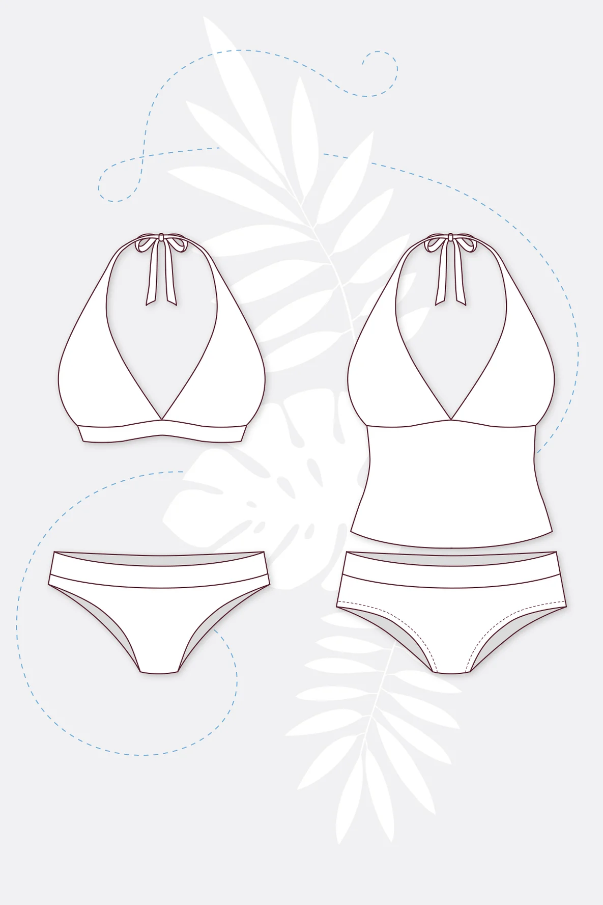 Jetzt brauchst du nie mehr Badeklamotten von der Stange zu kaufen! Stelle dir mit dem Schnittmuster „Victoria“ einfach deinen Wunsch-Bikini zusammen und nähe dir Ober- und Unterteil jeweils in der passenden Größe. Du hast die Wahl zwischen einem klassischen Neckholder-Bikini und einem Tankini sowie zwischen einem Slip und einem Panty. Den Tankini kannst du wahlweise mit einem gerafften Vorderteil nähen und die Triangel-Oberteile nach Belieben mit dekorativen Blenden versehen.