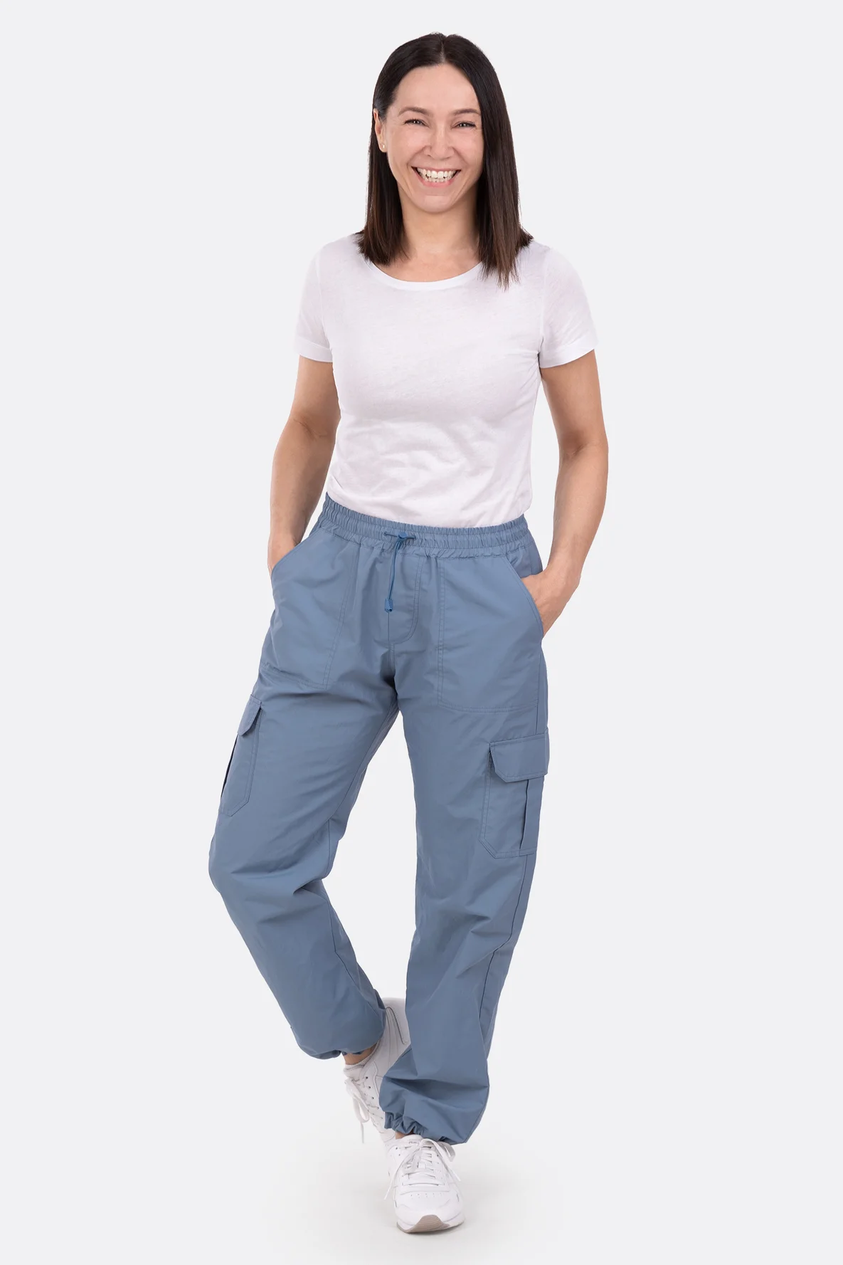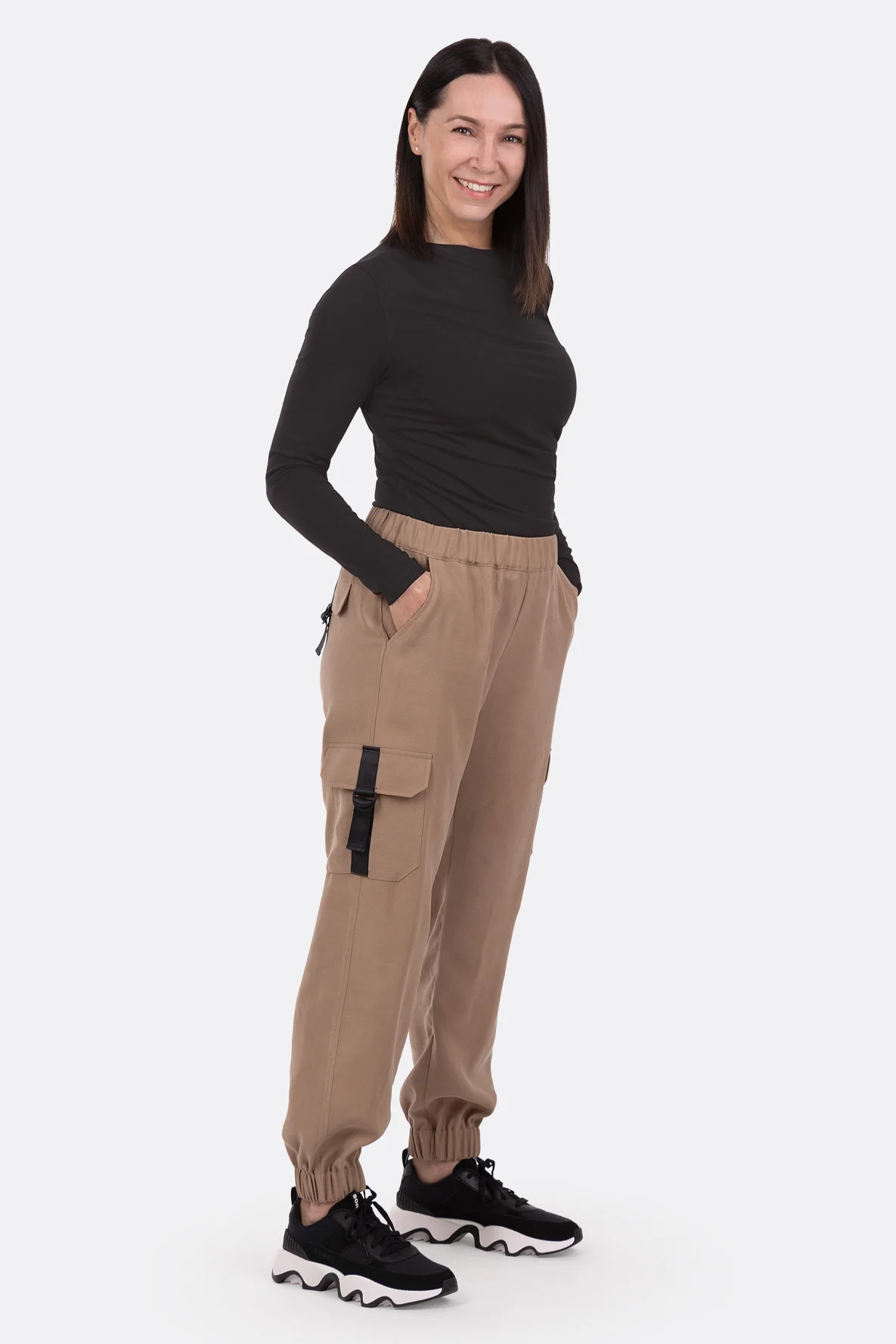 Aus einem leichten Trenchcoatstoff wird "Sydney" zu einer funktionellen Sport- und Wanderhose. Mit Gummikordeln und Stoppern lassen sich der Bund und die Säume flexibel einstellen.