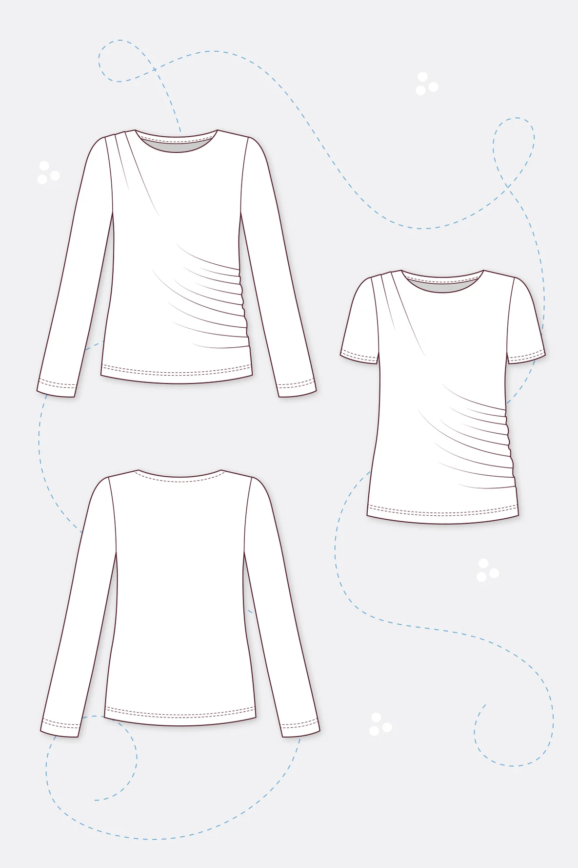 Zeitlos elegant und mit dezenter Raffinesse sind die Damenshirts, die mit unserem Schnittmuster "Suri" entstehen. Die in Falten gelegte Schulter und die zart gekräuselte Seitennaht verleihen dem Vorderteil eine schmeichelnde, asymmetrische Drapierung. Der runde, hoch geschlossene Ausschnitt wird vorne mit einem Beleg und am Rückenteil mit einem Stoffstreifen "auf die feine Art" versäubert. Das Shirt zeichnet sich durch eine körpernahe Passform aus und ist etwas verkürzt, so dass es sich ideal mit Röcken und modisch-weiten Hosen kombinieren lässt. Du hast die Wahl zwischen 4 Ärmellängen: kurz, halb, dreiviertel und lang. Aus Baumwoll- oder Viskosejersey ist "Suri" ein stilvoller Alltagsbegleiter, aus glänzendem Pannesamt oder glitzerndem Lurexjersey wird es zum Blickfang auf jeder Party!