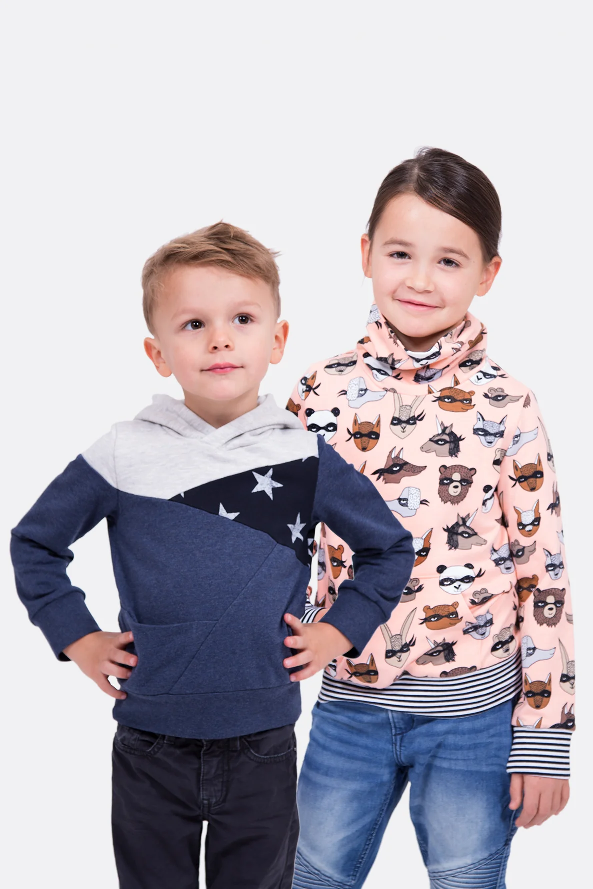 Mit unserem Freestyle Hoodie Schnittmuster kannst du einen Kapuzenpullover für Mädchen und Jungen ganz einfach selber nähen! Die Videoanleitung hilft dir dabei, den Pullover mit lässiger Wickelkapuze und stylischen Teilungsnähten Schritt für Schritt selber zu machen. Die Kinder werden sich über das selbst genähte Oberteil riesig freuen und voller Stolz darin toben und spielen. Mach deinen Kleinen doch eine Freude mit einem individuellen Pullover, den du nach Lust und Laune mit einer Kapuze oder einem Rollkragen sowie mit einer kleinen Tasche im Vorderteil nähen kannst. Die alternative Kängurutasche ist super zur Aufbewahrung kleiner Kinderschätze. Bündchen an den Ärmeln sowie am Saum sorgen für Bequemlichkeit und sind mit einer Overlockmaschine leicht genäht. Lass deiner Fantasie freien Lauf und stürze dich auf dein neues Nähprojekt. Und das Schönste daran? Du weißt ganz genau wer die Kleidung genäht hat, die du deinen Kindern anziehst. Selbst wenn du ein Nähanfänger bist ist das gar kein Problem, denn unsere Nähvideos erklären dir ganz genau, wie alles geht – und so wirst du ganz leicht mit unseren Anleitungen selbst zum Nähprofi. Such' dir ein paar coole Sweatstoffe aus und leg' einfach los!