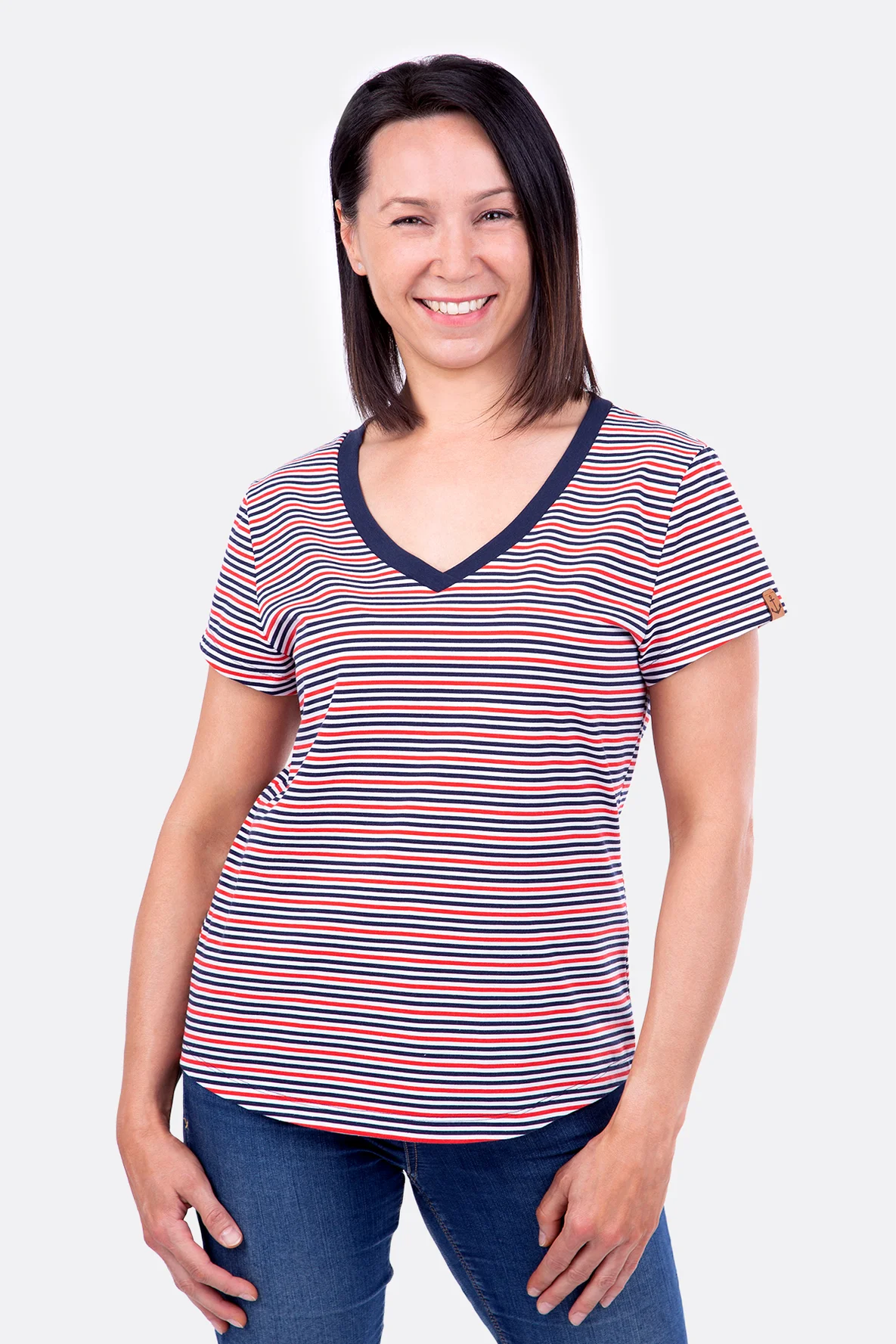 Das Schnittmuster zu dem sportlichen T-Shirt „Ava“ ermöglicht mit seinem wandelbaren Schnitt maximale Flexibilität für dein nächstes DIY-Projekt. Der schicke V-Ausschnitt, die lässig umgeschlagenen Ärmel und die Brusttasche setzen modische Highlights, sodass dein Basic-Shirt zu etwas ganz Besonderem wird. Mit deiner Stoffauswahl entscheidest du über den Stil: Als Hingucker beim Sport, prima in Kombination mit Leggings und Jacke oder auch im Alltag wird dieser Allrounder zum zeitlosen Klassiker oder kombiniert mit einem Rock, Teil eines femininen Outfits. Mit dem im Schnitt enthaltenen Add-On kannst du außerdem einen lässigen runden Saum nähen. Im passenden Nähvideo erfährst du, wie man ganz einfach einen V-Ausschnitt in ein T-Shirt nähen kann und zusammen mit der Nähanleitung ist das Selbernähen des Shirts auch als Anfänger ganz einfach.
