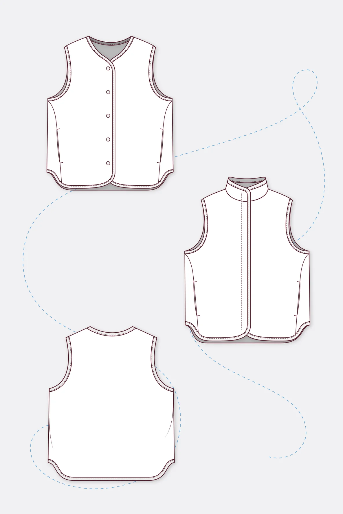 Weitere Zutaten: 85 cm Futterstoff (z.B. Baumwolljersey, Webware o. klass. Futterstoff), 85 cm Bügeleinlage (z.B. Vlieseline H 180), 5 bzw. 6 Druckknöpfe (Durchmesser 15 mm) oder teilbarer Reißverschluss (Längenangaben im Schnittmuster)