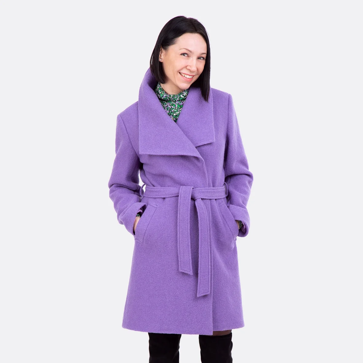 Kombiniere den Loden mit unserem Acetat-Futterstoff Violett, um damit einen gefütterten Damenmantel mit unserem Schnittmuster "Serena" zu nähen. Das Schnittmuster erscheint im Februar 2022, hier die Tabelle mit dem Stoffverbrauch.