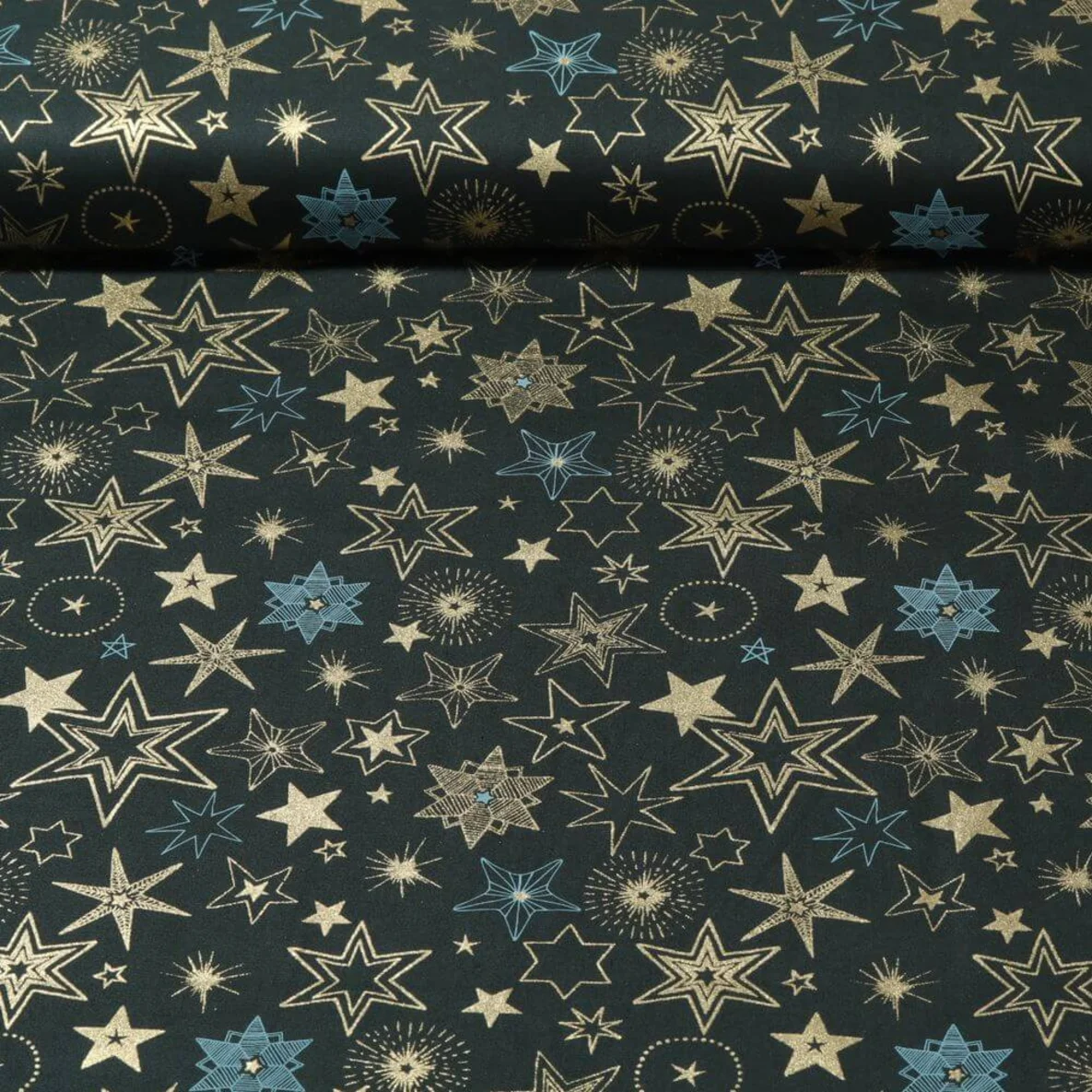 Weihnachtspopeline Sterne Mix Dunkelgrün Gold